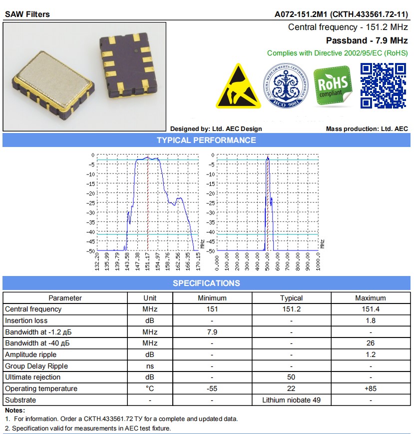 AEK安克晶體諧振器,A072-151.2M1,6G藍牙模塊晶振,SAW濾波器,7050mm貼片晶振,參數(shù)表