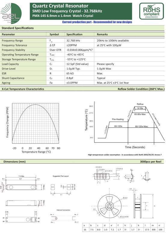 AEL晶振,PMX-145晶振,低抖動晶振,超小型,薄型,質地輕的表面貼片音叉型晶體振蕩器,手機晶體,產品體積小,特別適用于各種小巧的便攜式消費電子數碼產品,在移動通信領域得到了廣泛的應用,晶振產品本身可發揮優良的電氣特性,滿足無鉛焊接的高溫回流溫度曲線要求.