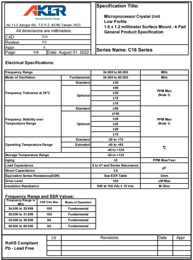 | C1E-16.000-12-20100-A-X1-R | Aker安碁 | CRYSTAL, 2016, 16.000MHZ, 12PF, | C1E Auto | 16 MHz |