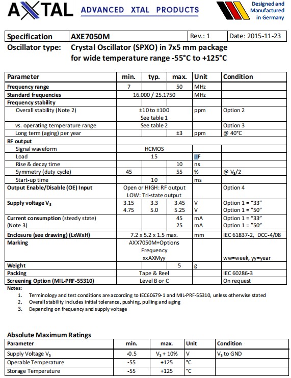 AXE7050M‐50-25‐4F-45.000MHz,7050mm,45MHz,AXTAL晶振,AXE7050M,有源晶振,參數(shù)表