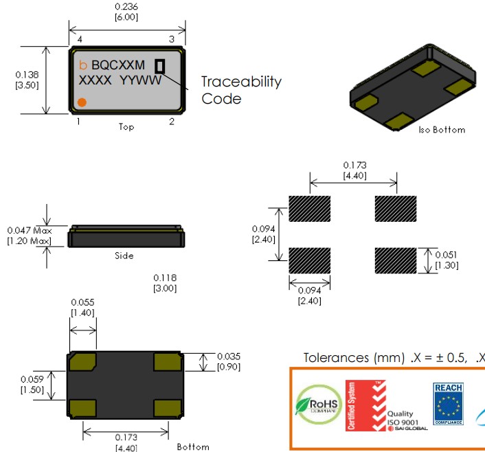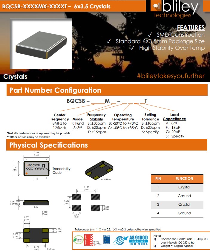 BQCSB-33MF-BCDFT,33MHz,6035mm,Bliley高穩定性晶振,BQCSB,石英晶體諧振器,美國進口晶振,Bliley百利晶振,型號:BQCSB系列晶振,編碼為:BQCSB-33MF-BCDFT,頻率為:33.000MHz,小體積晶振尺寸:6.0x3.5x1.2mm,四腳貼片晶振,無源晶振,石英晶振,6035晶振,石英晶體諧振器,SMD晶振,貼片石英晶振,無鉛晶振,工作溫度范圍:-40℃至+85℃。具有超小型,輕薄型,高精度,高性能,高品質,高質量,耐熱及耐環境特點。進口晶振,被廣泛應用于:通訊設備,無線網絡,藍牙模塊,物聯網,車載晶振,醫療設備,安防設備,平板電腦,智能家居,數碼電子等。