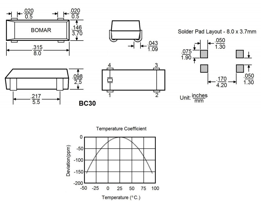 32.768KHz,BC30CCD112.5-32.768K,8038mm,Bomar品牌,BC30,實(shí)時(shí)時(shí)鐘晶振,美國進(jìn)口晶振,Bomar博馬爾晶振,型號(hào):BC30,編碼為:BC30CCD112.5-32.768K,精度:±20ppm,頻率穩(wěn)定性:±20ppm,負(fù)載:12.5pF,工作溫度范圍:-20℃至+70℃,頻率為:32.768KHz,小體積晶振尺寸:8.0x3.7x2.5mm陶瓷封裝,四腳貼片晶振,無源晶振,8038晶振,石英晶體諧振器,無鉛環(huán)保晶振,SMD晶振。具有超小型,輕薄型,良好的抗沖擊性和耐熱性。應(yīng)用程序包括:實(shí)時(shí)時(shí)鐘晶振,移動(dòng)通信晶振、芯片卡晶振、無線通信晶振,鐘表電子晶振,電腦主板晶振等應(yīng)用。