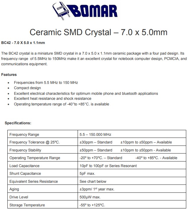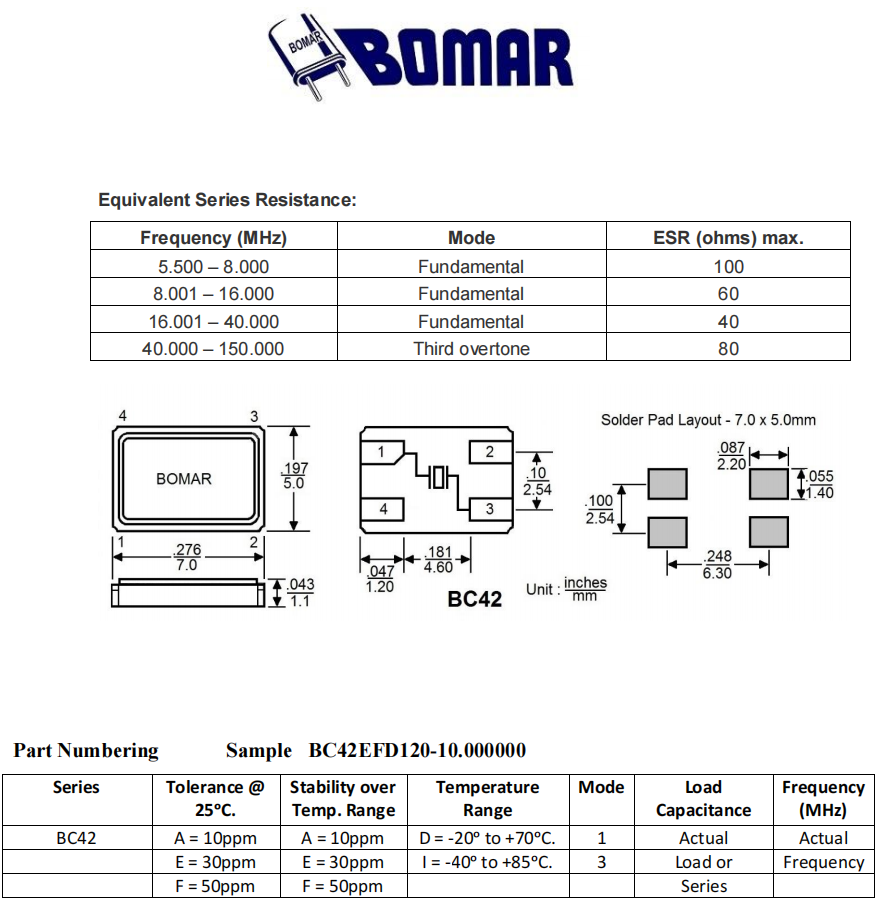 Bomar高性能晶振,BC42EFD120-10.000000,6G通信設備晶振,BC42AEI120-16.000000,陶瓷諧振器,參數表