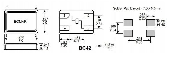 Bomar高性能晶振,BC42EFD120-10.000000,6G通信設備晶振,BC42AEI120-16.000000,陶瓷諧振器,尺寸圖