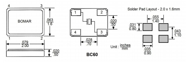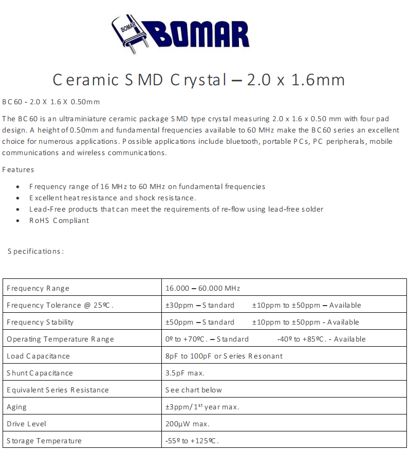 BC60EFD108-48.000000,Bomar無源晶振,平板電腦6G晶振,BC60FEI108-20.000000,SMD石英晶體,美國進口晶振,Bomar博馬爾晶振,型號:BC60系列,編碼為:BC60EFD108-48.000000,頻率為:48.000MHz,小體積晶振尺寸:2.0x1.6x0.5mm,四腳貼片晶振,無源晶振,石英晶振,石英晶體諧振器。BC60是一種超薄陶瓷封裝的SMD型晶體,帶有四個襯墊設計。0.50毫米的高度和基頻可達60MHz,使BC60系列成為許多應用的優秀選擇。應用程序包括:藍牙、便攜式個人電腦、PC外設、移動通信和無線通信等應用。