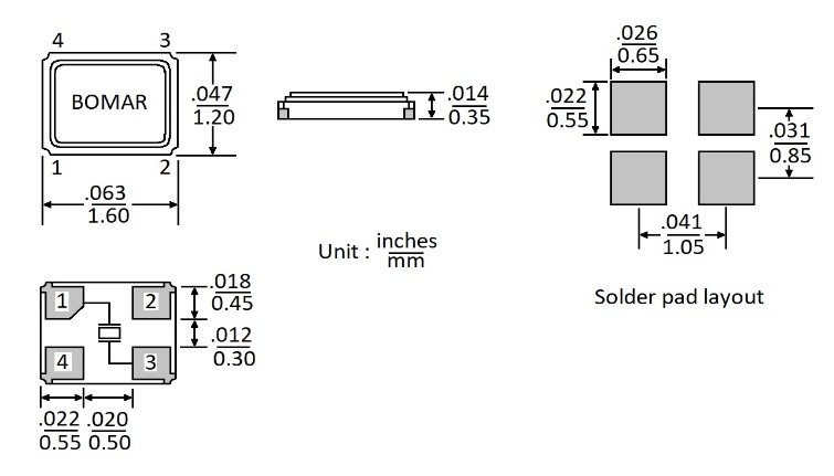 Bomar博馬爾晶振,BC63EFI120-30.000000,智能手機(jī)6G晶振,BC63AED120-45.000000,超小型晶振,尺寸圖