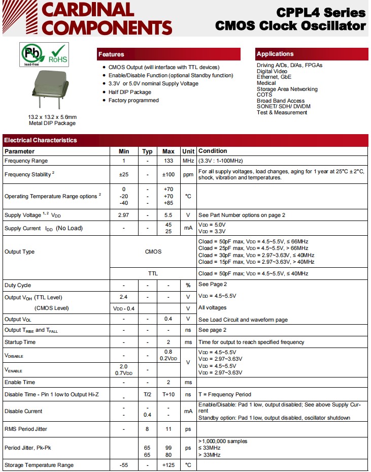 歐美Cardinal晶振/CPPLC4LTA5BR26.0TS/CMOS輸出振蕩器6G應用