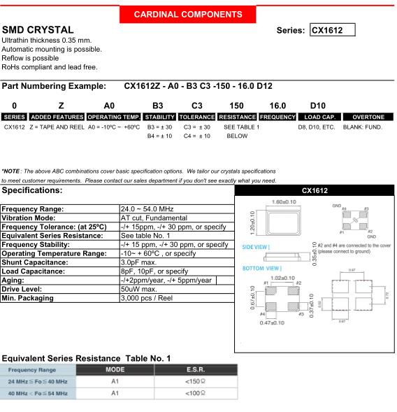 Cardinal晶振,CX1612晶振,CX1612Z-A0B3C3-150-16.0D12晶振,貼片晶振本身體積小,超薄型石英晶體振蕩器,特別適用于有目前高速發展的高端電子數碼產品,因為晶振本身小型化需求的市場領域,小型,薄型是對應陶瓷振蕩器(偏差大)和普通的石英晶體振蕩器(偏差小)的中間領域的一種性價比較出色的產品.產品廣泛用于筆記本電腦,無線電話,衛星導航SSD,USB,Blu-ray等用途,符合無鉛焊接的高溫回流焊曲線特性.