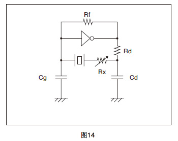 與晶振串聯連接上純電阻 Rx,確認振蕩的開始或結 束.緩慢地使 Rx 值逐漸變大 , 開始或結束振蕩時 的最大電阻 Rx 加上晶振的有效電阻 Re,就是該電 路的大概負性電阻的數值.負性電阻 |- R| = Rx + Re|−R| 為晶振的等效串聯電阻的最大值 (R1 max.) 的 5 倍以上.*Re 為振蕩時的有效電阻值.Re = R1 (1 + CO/CL ) 2