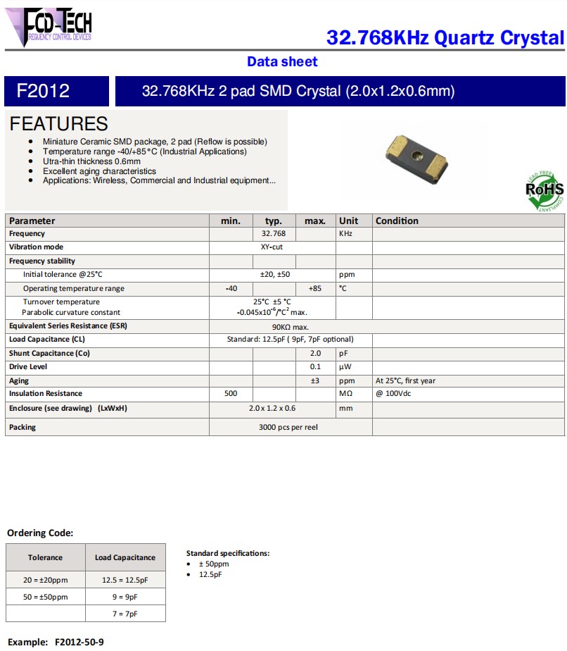 F2012‐50‐7,32.768KHz,2012mm,FCD-Tech無源晶振,F2012,計時器應用晶振,參數表