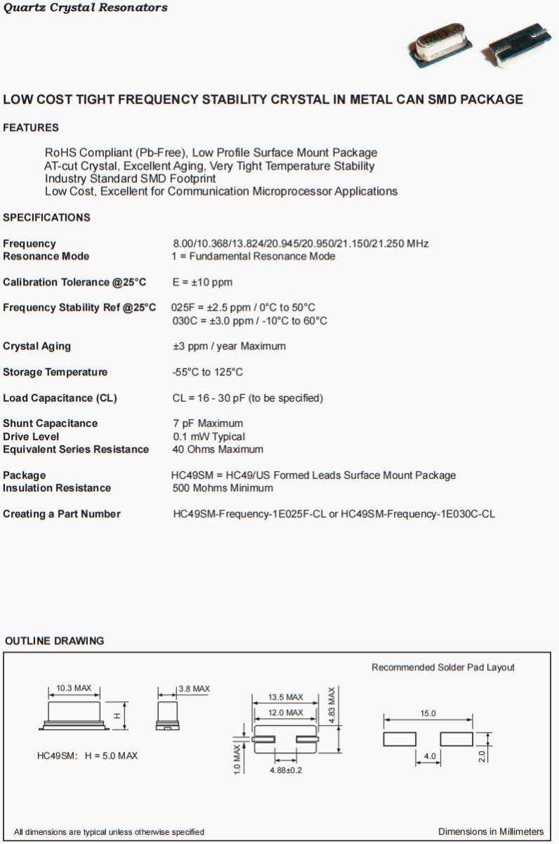 | 包裝 | HC49SM = HC49/US Formed Leads Surface Mount Package |