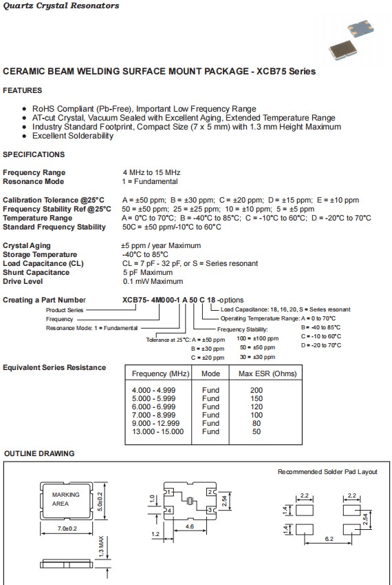 XCB75-7M000-1A50D18,7050mm,Fortiming品牌,7MHz,XCB75,四腳貼片晶振,美國進口晶振,Fortiming晶振,富通晶振,型號:XCB75系列,編碼為:XCB75-7M000-1A50D18,頻率為:7MHz,精度:±50ppm,頻率穩定性:±50ppm,工作溫度范圍:-20℃至+70℃,負載:18pF,小體積晶振尺寸:7.0x5.0x1.3mm封裝,四腳貼片晶振,石英晶振,7050晶振,SMD晶振,無源晶振,石英晶體諧振器。具有超小型,輕薄型,高性能,卓越的可解性特點。應用于:汽車電子晶振,通訊設備晶振,無線網絡晶振,藍牙晶振,智能家居晶振,數碼電子晶振等應用。