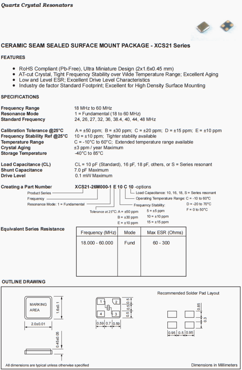 Fortiming耐高溫晶體,XCS21高精度晶振,XCS21-48M000-1E10D18網絡終端晶振,美國Fortiming晶振公司,富通晶振,超小型晶振,XCS21晶振,XCS21-48M000-1E10D18晶振,2016晶振,醫療設備晶振,低損耗晶振,SMD晶振,四腳晶振,低成本晶振,環保無鉛晶振,高穩定性晶振,石英晶振,貼片晶振,網絡終端晶振,無源晶振,陶瓷SEAM密封表面貼裝封裝- XCS21系列,特點,超小型設計(2x1.6x0.45 mm), at切割晶體,寬溫度范圍內緊密的頻率穩定性;優異的老化性能,低水平的ESR;卓越的驅動級特性,符合RoHS標準(無鉛),行業標準的足跡;非常適合高密度表面安裝。