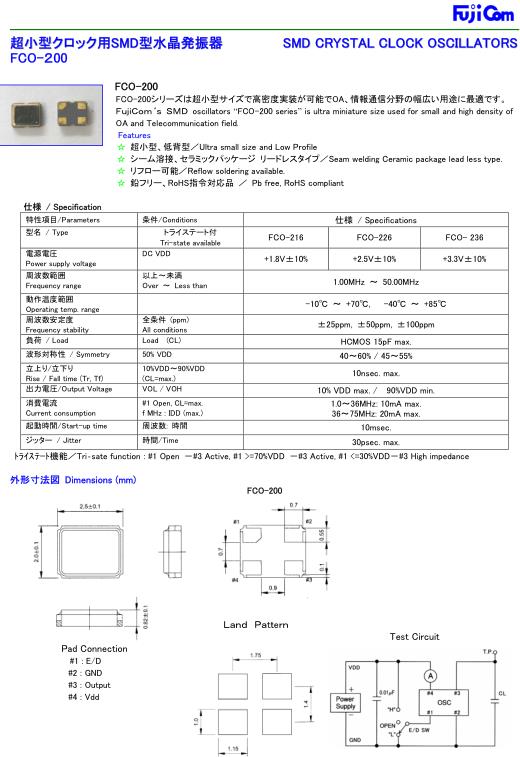 Fujicom晶振,FCO-216晶振,時鐘振蕩器,有源晶振,是指晶體本身起振需要外部電壓供應(yīng),起振后可直接驅(qū)動CMOS集成電路,產(chǎn)品本身已實現(xiàn)與薄型IC(TSSOP封裝,TVSOP封裝)同樣的1mm厚度,斷開時的消費電流是15µA以下,編帶包裝方式可對應(yīng)自動搭載及IR回流焊接(無鉛對應(yīng))產(chǎn)品有幾種電壓供選1.8V,2.5V,3V3.3V,5V,以應(yīng)對不同IC產(chǎn)品需要.