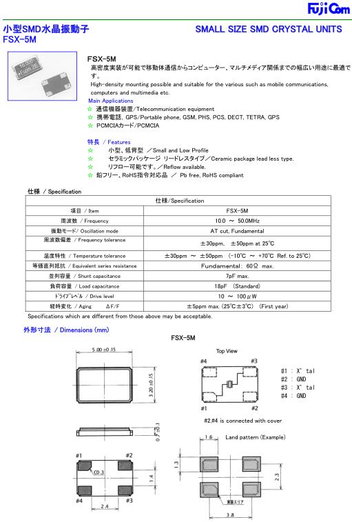 Fujicom晶振,FSX-5M晶振,電話專用晶振,智能手機晶振,產品具有高精度超小型的表面貼片型石英晶體振蕩器,最適用于移動通信終端的基準時鐘等移動通信領域.比如智能手機,無線通信,衛星導航,平臺基站等較高端的數碼產品,晶振本身小型,薄型具備各類移動通信的基準時鐘源用頻率,貼片晶振具有優良的電氣特性,耐環境性能適用于移動通信領域,滿足無鉛焊接的高溫回流溫度曲線要求.