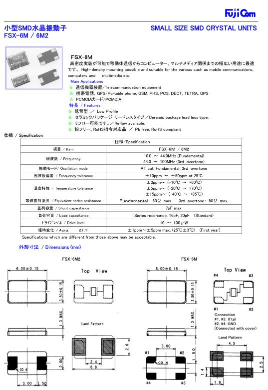 Fujicom晶振,FSX-6M晶振,6035mm晶振,小型貼片石英晶振,外觀尺寸具有薄型表面貼片型石英晶體振蕩器,特別適用于有小型化要求的市場領(lǐng)域,比如智能手機(jī),無線藍(lán)牙,平板電腦等電子數(shù)碼產(chǎn)品.晶振本身超小型,薄型,重量輕,晶體具有優(yōu)良的耐環(huán)境特性,如耐熱性,耐沖擊性,在辦公自動(dòng)化,家電相關(guān)電器領(lǐng)域及Bluetooth,WirelessLAN等短距離無線通信領(lǐng)域可發(fā)揮優(yōu)良的電氣特性,滿足無鉛焊接的回流溫度曲線要求.