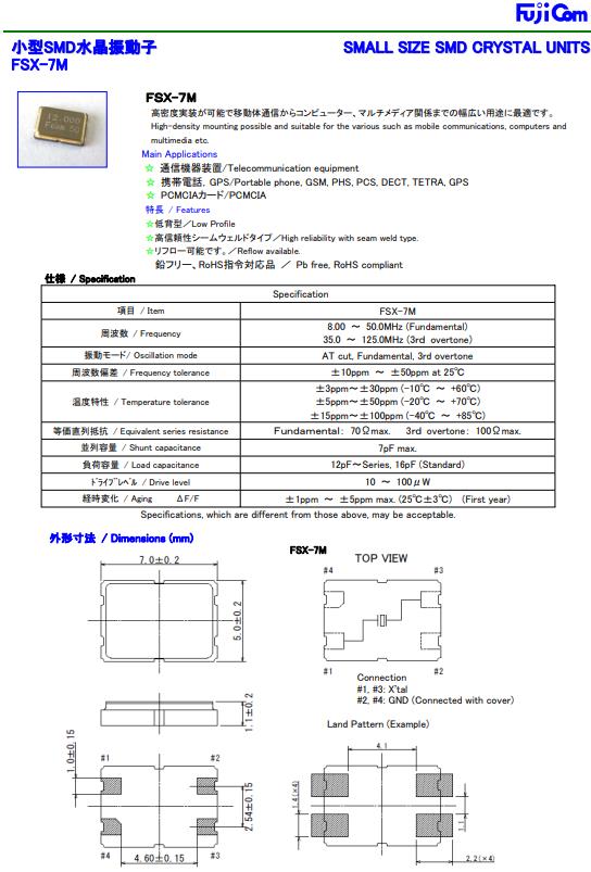 | 等価直列抵抗 / Equivalent series resistance | Fundamental: 70Ω max.3rd overtone:100Ω max. |