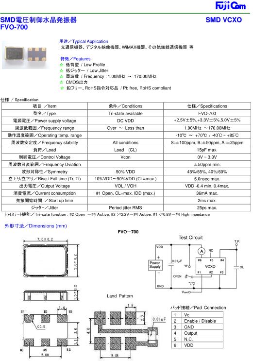 Fujicom晶振,FVO-700晶振,VCXO壓控晶振,小型SMD有源晶振,從最初超大體積到現(xiàn)在的7050mm,6035mm,5032mm,3225mm,2520mm體積,有著翻天覆地的改變,體積的變小也使產(chǎn)品帶來了更高的穩(wěn)定性能,接縫密封石英晶體振蕩器,精度高,覆蓋頻率范圍寬的特點(diǎn),SMD高速自動(dòng)安裝和高溫回流焊設(shè)計(jì),Optionable待機(jī)輸出三態(tài)輸出功能,電源電壓范圍:1.8V~5V,高穩(wěn)定性,低抖動(dòng),低功耗,主要應(yīng)用領(lǐng)域:無線通訊,高端智能手機(jī),平板筆記本W(wǎng)LAN,藍(lán)牙,數(shù)碼相機(jī),DSL和其他IT產(chǎn)品的晶振應(yīng)用,三態(tài)功能,PC和LCDM等高端數(shù)碼領(lǐng)域,符合RoHS/無鉛.