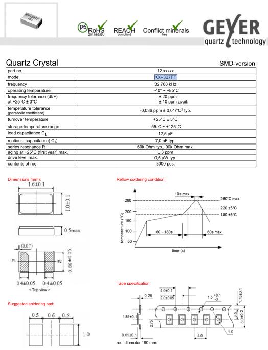 Geyer晶振,KX-327FT晶振,超小型晶振,32.768K時(shí)鐘晶體具有小型,薄型,輕型的貼片晶振表面音叉型晶體振蕩器,產(chǎn)品具有優(yōu)良的耐熱性,耐環(huán)境特性,可發(fā)揮晶振優(yōu)良的電氣特性,符合RoHS規(guī)定,滿足無鉛焊接的高溫回流溫度曲線要求,金屬外殼的封裝使得產(chǎn)品在封裝時(shí)能發(fā)揮比陶瓷振蕩器外殼更好的耐沖擊性.
