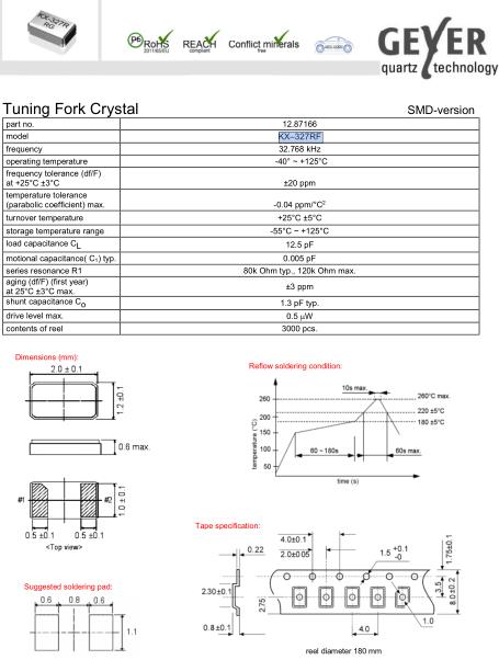 Geyer晶振,KX-327RF晶振,無源兩腳晶振,超小型,薄型,質地輕的表面貼片音叉型晶體振蕩器,手機晶體,產品體積小,特別適用于各種小巧的便攜式消費電子數碼產品,在移動通信領域得到了廣泛的應用,晶振產品本身可發揮優良的電氣特性,滿足無鉛焊接的高溫回流溫度曲線要求.