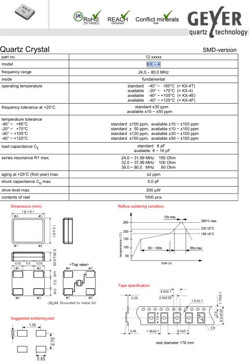 Geyer晶振,KX-7晶振,環保晶振,超小型表面貼片型SMD晶振,最適合使用在汽車電子領域中,也是特別要求高可靠性的引擎控制用CPU的時鐘部分.低頻晶振可從7.98MHz起對應,小型,超薄型具備強防焊裂性,石英晶體在極端嚴酷的環境條件下也能發揮穩定的起振特性,產品本身具有耐熱,耐振,耐撞擊等優良的耐環境特性,滿足無鉛焊接以及高溫回流溫度曲線要求,符合AEC-Q200標準.