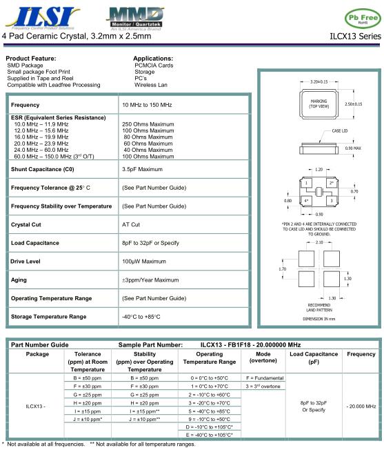 ILSI晶振,ILCX13晶振,ILCX13-FB1F18-20.000000MHz晶振,3225mm體積貼片晶振適用于汽車電子領域的表面貼片型石英晶振,本產品已被確定的高信賴性最適合用于汽車電子部件,晶體在極端嚴酷的環境條件下也能發揮穩定的起振特性,晶振本身具有耐熱,耐振,耐沖擊等優良的耐環境特性,滿足無鉛焊接的高溫回流溫度曲線要求,符合AEC-Q200標準.