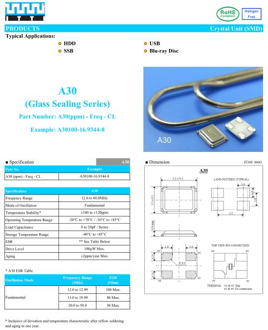 ITTI晶振,A30晶振,A30100-16.000-8晶振,超小型表面貼片型SMD晶振,最適合使用在汽車電子領(lǐng)域中,也是特別要求高可靠性的引擎控制用CPU的時鐘部分.低頻晶振可從7.98MHz起對應(yīng),小型,超薄型具備強(qiáng)防焊裂性,石英晶體在極端嚴(yán)酷的環(huán)境條件下也能發(fā)揮穩(wěn)定的起振特性,產(chǎn)品本身具有耐熱,耐振,耐撞擊等優(yōu)良的耐環(huán)境特性,滿足無鉛焊接以及高溫回流溫度曲線要求,符合AEC-Q200標(biāo)準(zhǔn).