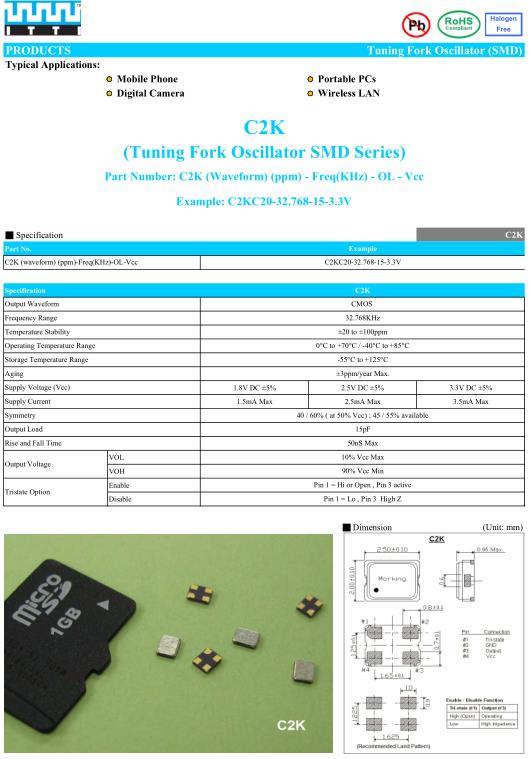 ITTI晶振,C2K晶振,C2KC20-32.768-15-3.3V晶振,32.768K時鐘晶體具有小型,薄型,輕型的貼片晶振表面音叉型晶體振蕩器,產品具有優良的耐熱性,耐環境特性,可發揮晶振優良的電氣特性,符合RoHS規定,滿足無鉛焊接的高溫回流溫度曲線要求,金屬外殼的封裝使得產品在封裝時能發揮比陶瓷振蕩器外殼更好的耐沖擊性.