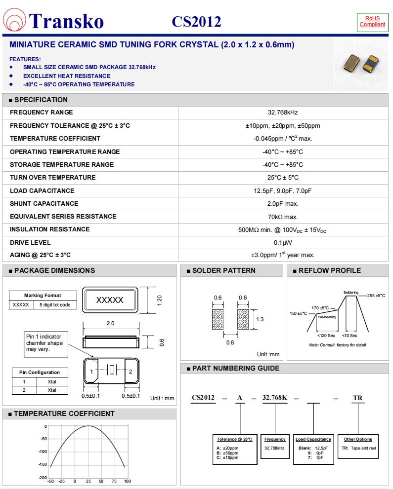 ITTI晶振,CS2012晶振,CS2012-32.768KHz-12.5-TR晶振,32.768K時鐘晶體具有小型,薄型,輕型的貼片晶振表面音叉型晶體振蕩器,產品具有優良的耐熱性,耐環境特性,可發揮晶振優良的電氣特性,符合RoHS規定,滿足無鉛焊接的高溫回流溫度曲線要求,金屬外殼的封裝使得產品在封裝時能發揮比陶瓷振蕩器外殼更好的耐沖擊性.