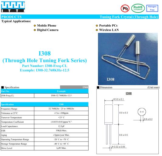 ITTI晶振,I308晶振,I308-32.768KHz-12.5晶振,插件石英晶振最適合用于比較低端的電子產品,比如兒童玩具,普通家用電器,即使在汽車電子領域中也能使產品高可靠性的使用.并且可用于安全控制裝置的CPU時鐘信號發生源部分,好比時鐘單片機上的石英晶振,在極端嚴酷的環境條件下,晶振也能正常工作,具有穩定的起振特性,高耐熱性,耐熱循環性和耐振性等的高可靠性能.
