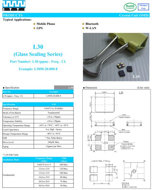 ITTI晶振,L30晶振,L3050-20.000-8晶振,小型貼片石英晶振,外觀尺寸具有薄型表面貼片型石英晶體振蕩器,特別適用于有小型化要求的市場領(lǐng)域,比如智能手機,無線藍牙,平板電腦等電子數(shù)碼產(chǎn)品.晶振本身超小型,薄型,重量輕,晶體具有優(yōu)良的耐環(huán)境特性,如耐熱性,耐沖擊性,在辦公自動化,家電相關(guān)電器領(lǐng)域及Bluetooth,WirelessLAN等短距離無線通信領(lǐng)域可發(fā)揮優(yōu)良的電氣特性,滿足無鉛焊接的回流溫度曲線要求.