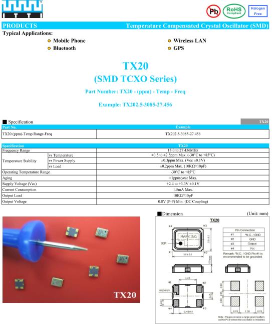 ITTI晶振,TX20晶振,TX202.5-3085-24.000晶振,有源晶振,是指晶體本身起振需要外部電壓供應(yīng),起振后可直接驅(qū)動CMOS集成電路,產(chǎn)品本身已實(shí)現(xiàn)與薄型IC(TSSOP封裝,TVSOP封裝)同樣的1mm厚度,斷開時的消費(fèi)電流是15µA以下,編帶包裝方式可對應(yīng)自動搭載及IR回流焊接(無鉛對應(yīng))產(chǎn)品有幾種電壓供選1.8V,2.5V,3V3.3V,5V,以應(yīng)對不同IC產(chǎn)品需要.