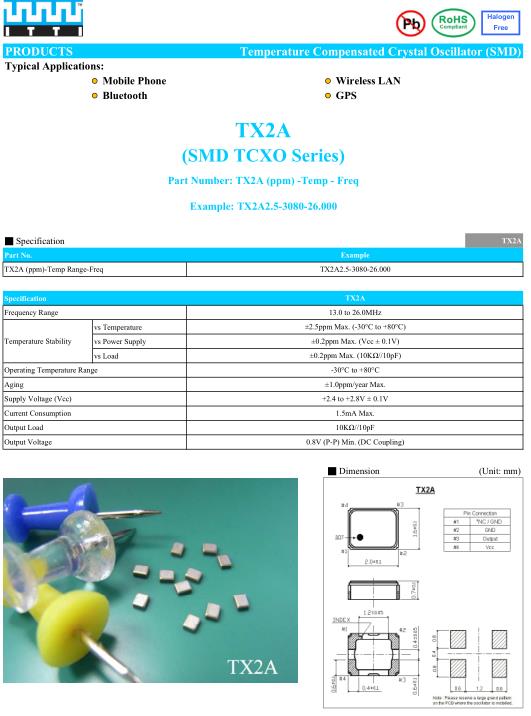 ITTI晶振,TX2A晶振,TX2A2.5-3080-20.000晶振,2016mm體積的溫補晶振(TCXO),是目前有源晶振中體積最小的一款,產品本身帶溫度補償作用的晶體振蕩器,該體積產品最適合于GPS,以及衛星通訊系統,智能電話等多用途的高穩定的頻率溫度特性晶振.為對應低電源電壓的產品..