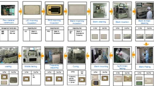 4.微調:使用真空鍍膜原理,將銀(金)鍍在芯片表面的銀(金)電極上,達到微調晶體諧振器的頻率達到規定要求.(插腳類產品產品較常使用)