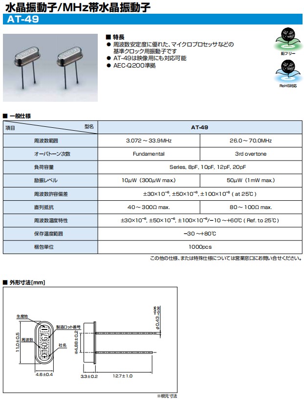 KDS石英晶振,AT-49橢圓型插件晶振,1AY289002DB進口晶振,無源晶振,數碼電子晶振,插件石英晶振最適合用于比較低端的電子產品,比如兒童玩具,普通家用電器,即使在汽車電子領域中也能使產品高可靠性的使用.并且可用于安全控制裝置的CPU時鐘信號發生源部分,好比時鐘單片機上的石英晶振,在極端嚴酷的環境條件下,晶振也能正常工作,具有穩定的起振特性,高耐熱性,耐熱循環性和耐振性等的高可靠性能。