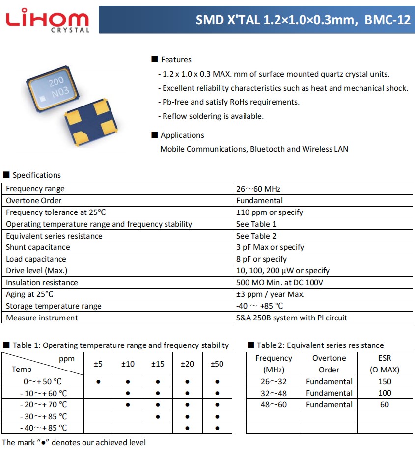 Lihom力宏晶振,BMC-12,1210mm超小型晶振,6G藍牙晶振,四腳貼片晶振,可穿戴設備晶振,參數表