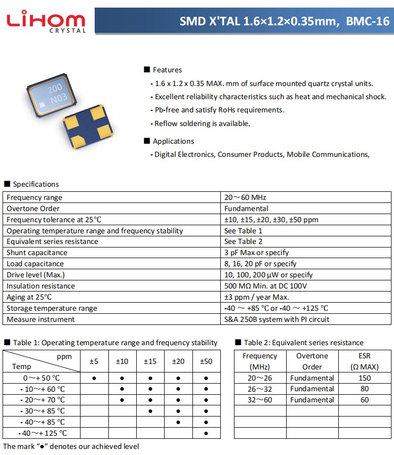 Lihom力宏無源晶振,BMC-16,數字電子產品6G晶振,1612mm石英晶振,韓國進口晶振,參數表