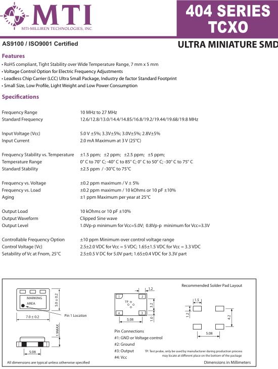 MTI Crystal可稱為米利倫晶振,擁有領先的制造技術和提供世界一流的客戶服務,專業提供MTI有源晶振,溫補晶振,貼片晶振等頻率元件,所有產品保證是高質量,精確和穩定的頻率控制元器件,并以高品質,高性能的產品得到市場的認可,使得MTI晶振聞名于天下.MTI晶振,404晶振,TCXO溫補晶振.