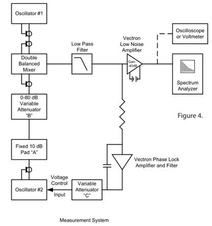 為避免混頻器飽和,一個振蕩器的信號電平會被10dB衰減(衰減器"A")永久衰減.在校準期間,此款有源晶振的電平額外衰減80dB(衰減"B"),以改善頻譜分析儀的動態范圍.振蕩器在頻率上是機械偏移的,并且所得到的低頻差拍信號的幅度表示-80dB的水平;它是所有后續測量的參考.使用掃頻分析儀時,此電平調整到頻譜分析儀屏幕的頂行.使用數字(FFT)頻譜分析儀時,儀器經過校準,可讀取相對于此電平的RMSVOLTS/√Hz.當完全電平恢復到混頻器并且振蕩器被鎖相時,將相對于-80dB電平測量相位噪聲.