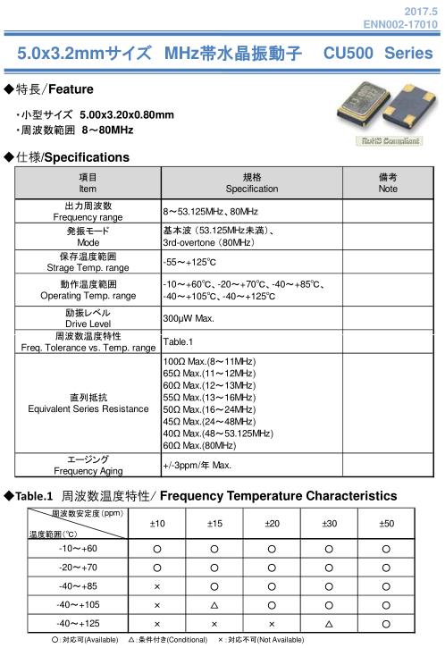 NAKA晶振,CU500晶振,日本納卡株式會社,小型表面貼片晶振型,是標準的石英晶體振蕩器,適用于寬溫范圍的電子數碼產品,家電電器及MP3,MP4,播放器,單片機等領域.可對應8.000MHz以上的頻率,在電子數碼產品,以及家電相關電器領域里面發揮優良的電氣特性,滿足無鉛焊接的回流溫度曲線要求.