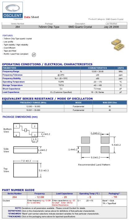Oscilent晶振,264-12.0M-20-S-TR晶振,高性能晶振,貼片晶振本身體積小,超薄型石英晶體振蕩器,特別適用于有目前高速發展的高端電子數碼產品,因為晶振本身小型化需求的市場領域,小型,薄型是對應陶瓷振蕩器(偏差大)和普通的石英晶體振蕩器(偏差小)的中間領域的一種性價比較出色的產品.產品廣泛用于筆記本電腦,無線電話,衛星導航SSD,USB,Blu-ray等用途,符合無鉛焊接的高溫回流焊曲線特性.