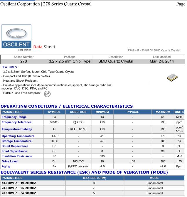 Oscilent晶振,278-25.0M-20-W-TR晶振,高品質(zhì)晶振,超小型表面貼片型SMD晶振,最適合使用在汽車電子領(lǐng)域中,也是特別要求高可靠性的引擎控制用CPU的時(shí)鐘部分.低頻晶振可從7.98MHz起對(duì)應(yīng),小型,超薄型具備強(qiáng)防焊裂性,石英晶體在極端嚴(yán)酷的環(huán)境條件下也能發(fā)揮穩(wěn)定的起振特性,產(chǎn)品本身具有耐熱,耐振,耐撞擊等優(yōu)良的耐環(huán)境特性,滿足無(wú)鉛焊接以及高溫回流溫度曲線要求,符合AEC-Q200標(biāo)準(zhǔn).