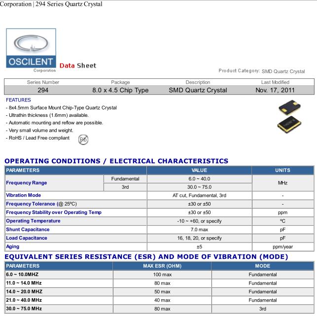 Oscilent晶振,294-10.0M-20GR-TR晶振,無源貼片晶振,貼片晶振本身體積小,超薄型石英晶體振蕩器,特別適用于有目前高速發展的高端電子數碼產品,因為晶振本身小型化需求的市場領域,小型,薄型是對應陶瓷振蕩器(偏差大)和普通的石英晶體振蕩器(偏差小)的中間領域的一種性價比較出色的產品.產品廣泛用于筆記本電腦,無線電話,衛星導航SSD,USB,Blu-ray等用途,符合無鉛焊接的高溫回流焊曲線特性.