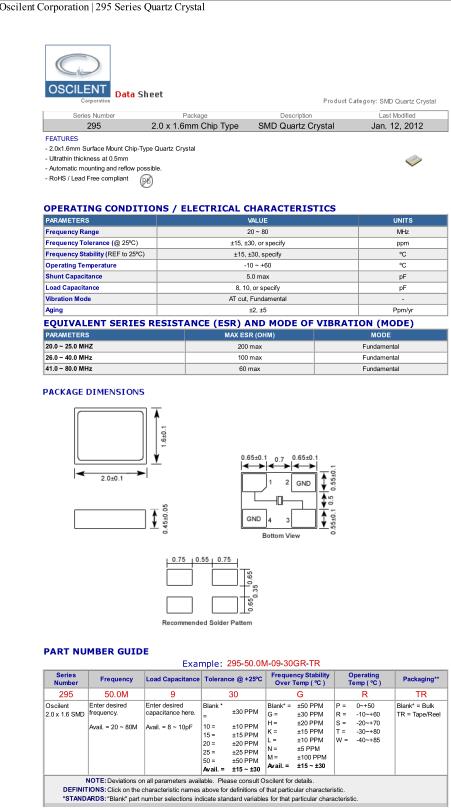 Oscilent晶振,295-50.0M-09-30GR-TR晶振,超小型晶振,貼片晶振本身體積小,超薄型石英晶體振蕩器,特別適用于有目前高速發展的高端電子數碼產品,因為晶振本身小型化需求的市場領域,小型,薄型是對應陶瓷振蕩器(偏差大)和普通的石英晶體振蕩器(偏差小)的中間領域的一種性價比較出色的產品.產品廣泛用于筆記本電腦,無線電話,衛星導航SSD,USB,Blu-ray等用途,符合無鉛焊接的高溫回流焊曲線特性.