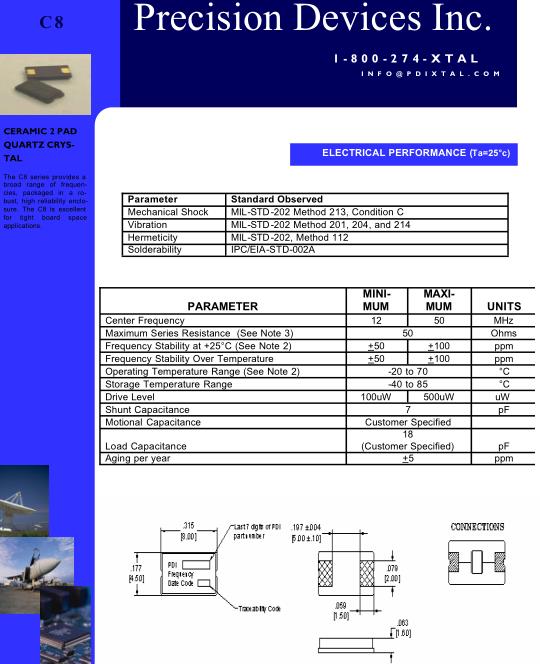 PDI晶振所制造的頻率控制設備使用在軍事,工業,醫學,航空電子設備和商業的市場。PDI在1989年已經是頻率控制設備的主要供貨商,主要供應溫補晶振,SMD晶振,石英晶體振蕩器等元件.PDI晶振,C8晶振,12MHZ晶振.