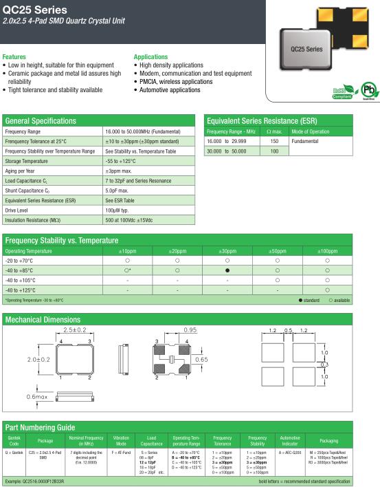 QANTEK晶振,QC25晶振,QC2516.0000F12B33R晶振