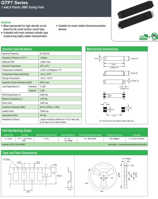 QANTEK晶振,QTP7晶振,QTP732.76812B20R晶振,貼片表晶32.768K系列具有超小型,薄型,質(zhì)地輕的表面貼片音叉型石英晶體振蕩器,晶振產(chǎn)品本身具備優(yōu)良的耐熱性,耐環(huán)境特性,在辦公自動化,家電領(lǐng)域,移動通信領(lǐng)域可發(fā)揮優(yōu)良的電氣特性,符合無鉛標(biāo)準(zhǔn),滿足無鉛焊接的回流溫度曲線要求,金屬外殼的石英晶振使得產(chǎn)品在封裝時能發(fā)揮比陶瓷晶振外殼更好的耐沖擊性能.