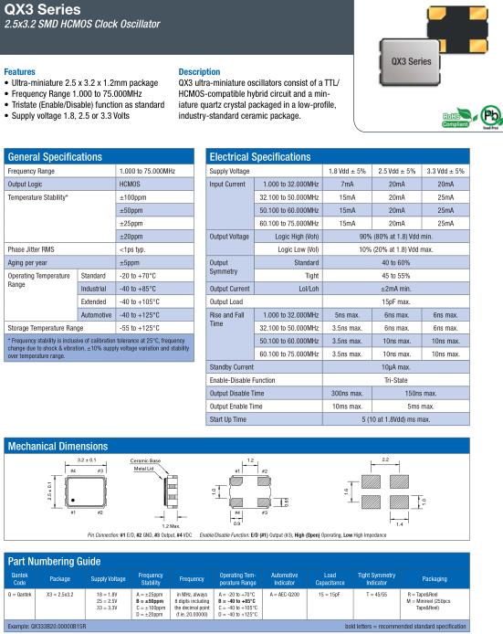 QANTEK晶振,QX3晶振,QX333B24.00000B15R晶振,小型SMD有源晶振,從最初超大體積到現(xiàn)在的7050mm,6035mm,5032mm,3225mm,2520mm體積,有著翻天覆地的改變,體積的變小也使產(chǎn)品帶來(lái)了更高的穩(wěn)定性能,接縫密封石英晶體振蕩器,精度高,覆蓋頻率范圍寬的特點(diǎn),SMD高速自動(dòng)安裝和高溫回流焊設(shè)計(jì),Optionable待機(jī)輸出三態(tài)輸出功能,電源電壓范圍:1.8V~5V,高穩(wěn)定性,低抖動(dòng),低功耗,主要應(yīng)用領(lǐng)域:無(wú)線通訊,高端智能手機(jī),平板筆記本W(wǎng)LAN,藍(lán)牙,數(shù)碼相機(jī),DSL和其他IT產(chǎn)品的晶振應(yīng)用,三態(tài)功能,PC和LCDM等高端數(shù)碼領(lǐng)域,符合RoHS/無(wú)鉛.