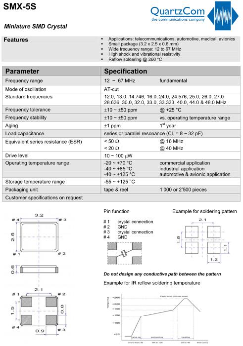 QuartzCom晶振,SMX-5S晶振,汽車專用晶振,3225mm體積貼片晶振適用于汽車電子領域的表面貼片型石英晶振,本產品已被確定的高信賴性最適合用于汽車電子部件,晶體在極端嚴酷的環境條件下也能發揮穩定的起振特性,晶振本身具有耐熱,耐振,耐沖擊等優良的耐環境特性,滿足無鉛焊接的高溫回流溫度曲線要求,符合AEC-Q200標準.