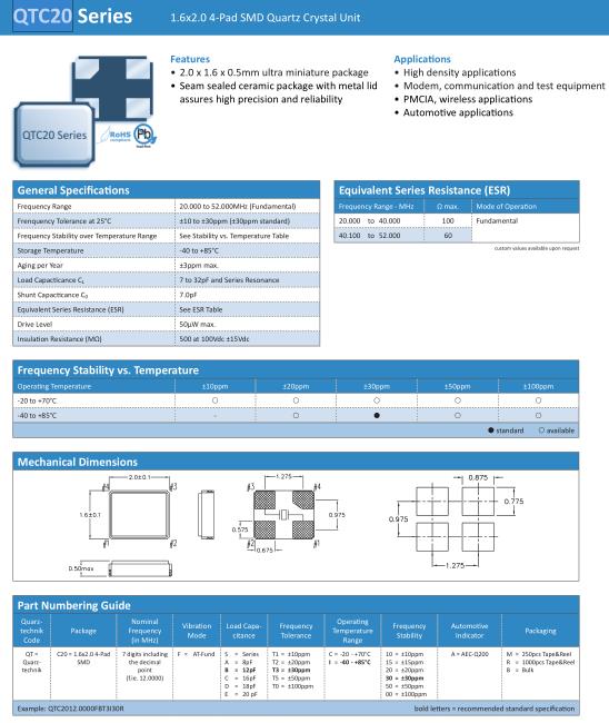 Quarztechnik晶振,QTC20晶振,QTC2012.0000FBT3I30R晶振,貼片晶振本身體積小,超薄型石英晶體振蕩器,特別適用于有目前高速發(fā)展的高端電子數(shù)碼產(chǎn)品,因為晶振本身小型化需求的市場領域,小型,薄型是對應陶瓷振蕩器(偏差大)和普通的石英晶體振蕩器(偏差小)的中間領域的一種性價比較出色的產(chǎn)品.產(chǎn)品廣泛用于筆記本電腦,無線電話,衛(wèi)星導航SSD,USB,Blu-ray等用途,符合無鉛焊接的高溫回流焊曲線特性.